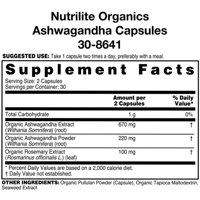 Nutrilite Organics Ashwagandha Capsules is an organic herbal supplement designed to help support the body’s natural response to stress while promoting restful sleep and emotional balance. The formula contains organic ashwagandha root extract and rosemary to support calmness and overall well-being.