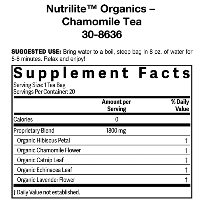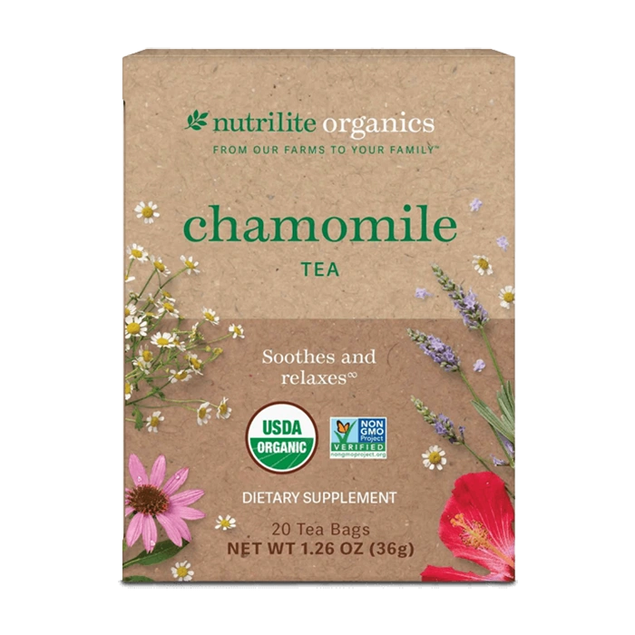 Nutrilite Organics Chamomile Tea is a calming organic herbal tea designed to help you relax and unwind. This caffeine-free blend contains chamomile, hibiscus, lavender, echinacea, and catnip grown on certified organic farms to support relaxation and a peaceful evening routine.