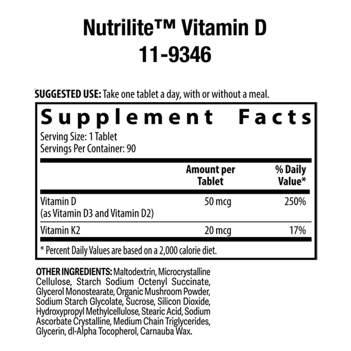 The Vitamin D Supplement Nutrilite Vitamin D is designed to support strong bones, immune health, and overall wellness. This plant-based formula includes vitamin D sourced from mushrooms and added vitamin K2 for better calcium utilization.